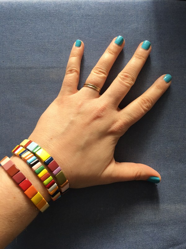 If you’re looking for a role model in this department, I’m sorry to say that I will be of little assistance. Some days I love the simplicity and easy confidence of all black. Some days I rage against the black. This week I couldn’t wait to wear my new rainbow bracelets and Fierce Pizza Cat T-shirt to trio.