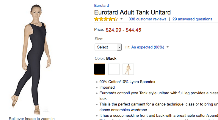 So in high-intensity class situations, I wear a unitard with a shirt over top. My gateway onesie was this one from Eurotard, a company that straight-up sounds like it was named by Dieter from Sprockets. But the thing works, people.